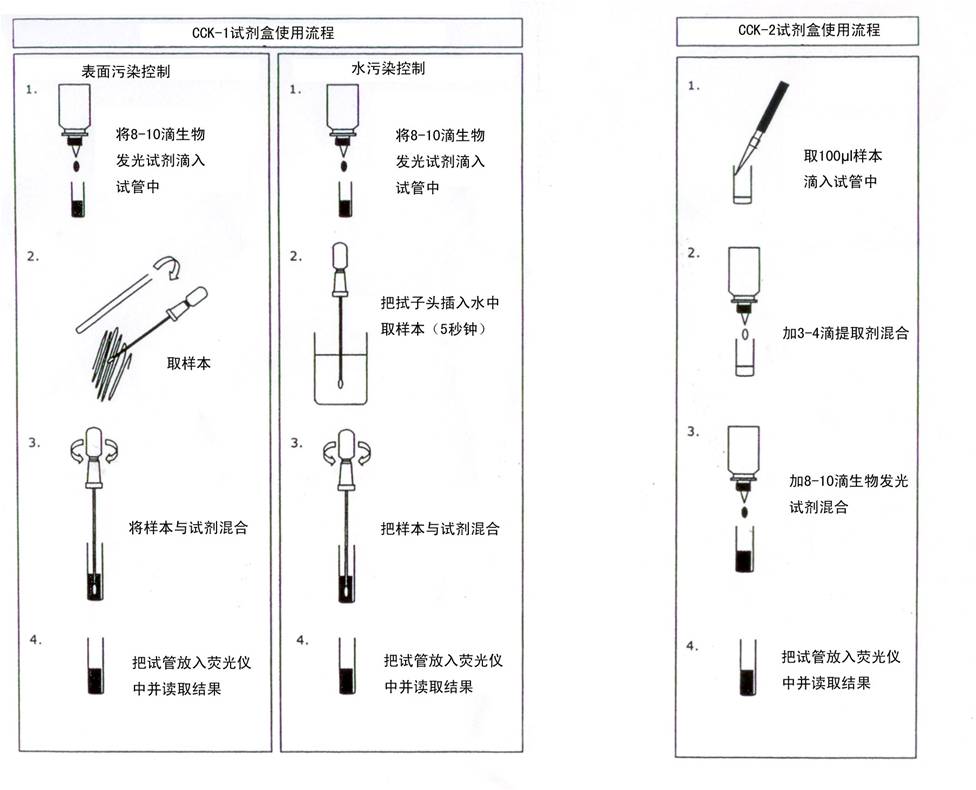 使用相关试剂对细菌外ATP行降解、消除。再使用提取液释放细菌内的ATP并通过酶阻止ATP的降解,后加入荧光素酶与ATP行发光反应。