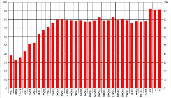 8. 频谱特性: 见图(输入白噪声,消声室内距声源中心2米处测量)